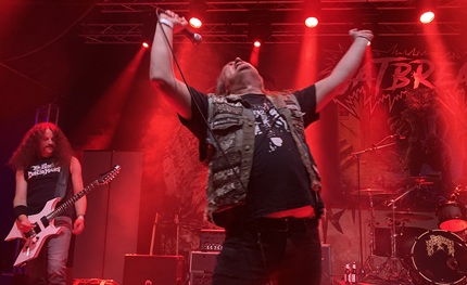 Draußen liegen die Temperaturen bei kurz über null, hier drinnen verspricht das grandiose Billing des „Evil Obsession“ heißere Temperaturen. Blöderweise haben wir keine Ohrstöpsel dabei, bloß weil wir heute mit einem anderen Auto angereist sind, wo keine im Handschuhfach liegen. In der Halle haben sie auch grad keine mehr vorrätig, doch zum Glück treffen wir jemand, der netterweise aushelfen kann. Das haben wir schnell noch vor den im Moment ziemlich angesagten Catbreath erledigt, als das Quartett aus Kiel sein Intro selbst spielt. Sehr angenehm, im Gegensatz zu vielen anderen, die vorm Loslegen lieber irgendwas vom Band abspielen lassen. Von der Thrash- und Crossoverbande wird uns straight auf die Fresse gegeben und man bemerkt sehr schnell, dass der Vierer sich selbst nicht allzu ernst nimmt. Shouter Philipp hüpft und albert quer über die breite Bühne, die ihm auch noch Raum genug bietet, lustig im Kreis zu laufen. Der Menge gefällt das und wir hören nach „Head Of The Snake“ sehr viele Hey-Rufe. Nach achtundzwanzig Minuten ist aber Schicht. Zeit, noch ein Quadrat frischer Pizza im Bistro abzugreifen, auf das wir uns schon vorher gefreut haben.