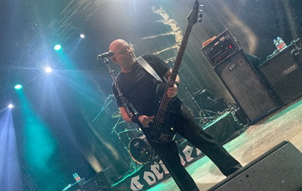 Die besten Karten haben heute Coroner. Die waren vor ein paar Jahren auf dem Rock Hard Festival schon genial, haben nun ein neues Megaalbum, das schon in den Jahresauswertungen ganz oben anzutreffen ist, ein bekanntes Line-up und sind Top of the Bill. Außerdem stehen so einige verwaschene Shirts und Patches der Progthrasher in der gut gefüllten Halle. Watt willste mehr? Nach diesem großartigen Gig von ihren Landsleuten der Band zuvor musste jedoch auch erstmal nachlegen. Auf jeden Fall haben sie schon mal das obercoole Backdrop mit dem verknöcherten DNA-Strang vom Albumcover. Die Menge steht nun sehr dicht an der Bühne und bewegt sich im Takt mit. Wir hören wie auf Platte Synths im Back und die Band hat dazu einen Tastenmann am Bühnenrand platziert, also nixda Playback, sondern ganz offensichtlich stehen die Eidgenossen zu ihrem Sound und bringen alles sichtbar auf die Stage. An der Reihe ist nun das epische „Serpent Moves“ vom „Grin“ Album, dem tatsächlich schon zweiunddreißig Jahre alten Vorgänger. Mister Tommy Vetterli liefert grandios exakte Gitarrenarbeiten mit so einigen Hut-ab Momenten; seine laut schneidenden Soli grellen durch die Fabrik. Die Rhythmik von „Semtex Revolution“ vom „Mental Vortex“ Album geht sofort in die Menge über, die sich spürbar von den Atmosphären tragen lässt. Schließlich stellt Ron die Band plus Tastenmann vor und merkt weiter an, dass sie leider keine Shirts dabei haben. Ein namentlich benanntes, braunfarbenes Versandunternehmen mit drei Buchstaben soll es verbockt haben. Das verkraften wir ebenso wie die Randnotiz, dass Coroner für Dark Angel eingesprungen sind, weil sie nämlich alle zweiundachtzig Minuten amtlich geliefert und nur zufriedene Gesichter hinterlassen haben. Bleibt zum Schluss nur noch etwas Negativkritik an die Location, dass der Inhalt von Viertelliterbechern was für den hohlen Zahn ist, und Wasser so viel wie das Bier kostet.