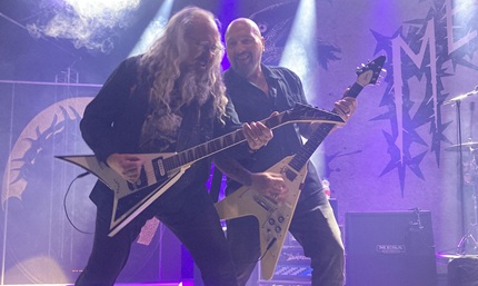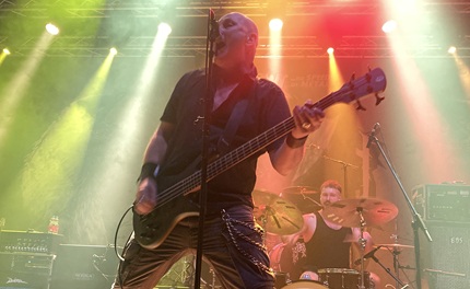 Grad keine Ahnung, ob wir Messiah schon einmal live gesehen haben. Ihre Erstwerke „Hymn To Abramelin“, „Extreme Cold Weather“ und „Choir Of Horrors“ bis Anfang der Neunziger waren damals und sind auch heute noch auf jeden Fall exzellentes Futter für extremere Metaller. Sehr schön daher auch, dass diese Alben heute Abend am Merch auch als Vinyl abgreifbar sind. Der Fünfer betritt unter Applaus die Bretter und nach den ersten Klängen des Opening-Doppels „Sikhote Alin“ und dem Titelstück der neuen Scheibe „Christus Hypercubus“ herrscht gleich eine ganz andere Stimmung in der Fabrik. Die Schweizer fegen echt was weg, und allein schon vom Publikumszuspruch her scheint es hier in der Fabrik nun loszugehen. Das Publikum dreht auf, was man auch bei „Choir Of The Lies“ deutlich spürt. Mit den beiden vor ein paar Jahren Dazugekommenen passiert richtig was auf der Bühne, denn Poltergeist Gitarrist V.O. Pulver und Shouter Marcus sind wahrlich keine Kinder von Traurigkeit und agieren sehr bewegungsfreudig. Der Mikrofonständer wird an jeder Stelle der Bühnenfront in alle Richtungen gezirkelt. Auf einmal meint er, zieht euch warm an, für „Extreme Cold Weather“. Das hat er nicht zum ersten Mal gesagt, beendet mit dem Track aber schon den Auftritt. Für fast eine ganze Stunde haben wir exzellente Unterhaltung bekommen, gerne wieder.