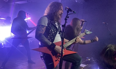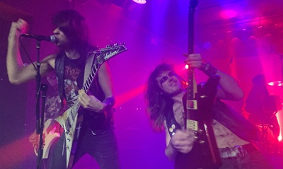 Die Bühnenrandale der nächsten Band hat sich längst herumgesprochen und natürlich gehören Intöxicated heute auf das Billing. Zu „Red Light Ripper“, läuft das Bier auch aus Körperöffnungen, die zum Einfüllen bestimmt sind. Shouter Mariano ist bekannt für seine Performance mit dem Gerstensaft und hat auch andauernd eine Pulle in der Hand. Wie erwartet entsteht ordentlich Frontrow Gebange und Geschiebe. Während der Mischer nur rotes und blaues Licht zulässt, macht der Fünfer offensichtlich abrocktechnisch mächtig Eindruck. „Rock ‚n‘ Roll Hell Patrol“ und „Take This Torch“ von Razor lassen selbstredend die Fäuste recken, bis das unverzichtbare „The Sword“, und unser Fave „Sadistic Night“ anschließend noch für Stimmung sorgt. Dann wird nach „Bad Habbits“ und „Crush Your Local Disco“ leider schon das Ende eingeläutet. Aber es wird nicht lange dauern, bis diese Helden wieder auf einer Bühne zum Abriss auftauchen!