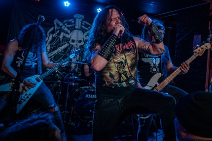 Ganz klare Kiste sind Knife derzeit der heißeste Scheiß, wenn es um deftigeren Metal mit Oberarschtrittfaktor geht. Das hat sich längst bis über die Landesgrenzen herumgesprochen, zumal einige Schweizer regelmäßig mehrere hundert Kilometer auf sich nehmen, um ihre Helden live zu sehen. Hier und heute im Don’t Panic kann man der Menge auch sehr gut anmerken, dass sie Bock hat. Shouter Vince Nihil ist inzwischen noch unter anderem mit Drummer Husky, Gitarrist Holger von Abandoned und ex-Sacred Steel Basser Patrick bei Distant Thunder aktiv. Das sollte was werden, zumal er ja auch dafür bekannt ist, alles in Grund und Boden zu brüllen, wie zuletzt mit Knife live im MuK in Gießen. Heute performt er mal chic im Manowar-Shirt, welches nur noch vom „Wheels Of Steel“ Motiv auf dem Shirt von Basser Phillip getoppt wird. Selbstredend feuern sie ihre Songs, auch die vom aktuellen Album „Heaven Into Dust“, breitbeinig und angriffslustig in die Menge, und ehe wir uns versehen, ist das Quartett mit „Sword Looser“, „K.N.I.F.E.“ und „White Witch/Black Death“ schon fast durch mit seinem Programm. Nun ja, die Messe ist nach fast neunzig Minuten gelesen. Ohne Frage hätten wir noch mehr davon vertragen können, da empfindet man jeden Schluss als zu früh. Morgen hält der Tourtross in Kassel, und da will man wieder fit abreißen!