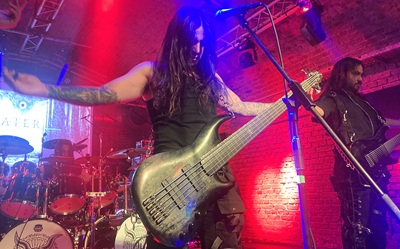 Obwohl dieser nicht uninteressant besetzte Tourtross bereits in der Fabrik zu Coesfeld stoppte, finden wir erst heute dazu, und das dann noch ziemlich spontan. Nun ja, Karten gibt es noch an der Abendkasse und zu voll wird es nicht. Beim Opener von Ater stehen zusammen ganze einundzwanzig Saiten auf der Bühne, bedient von drei Frontern. Mit definitiv ungetriggerten Drums, knusprig halligen Tiefgrowls und auch klaren Gesängen werden von dem Vierer aus Chile alle Subebenen ausgelotet. Bis auf eine langsame, synchrone Auf- und Abbewegung ihrer Arme sehen wir eine recht statische Performance. In den Pausen zwischen den Songs spielen Synthies aus dem Back weiter, während die Saitenfraktion oft ihre Geräte stimmt. Die Masse an Strings will halt exakt klingen. Sonst wird auf alles Melodische verzichtet, bis auf eine Akustikphase zum Schluss. Der Sound kommt schön hölzern tight, dauert aber bloß 26 Minuten an. Klar, bei fünf Bands an einem Montagabend muss man das Programm schon stramm durchziehen, aber für die Fans zu wenig Material zu bringen, muss auch nicht sein.