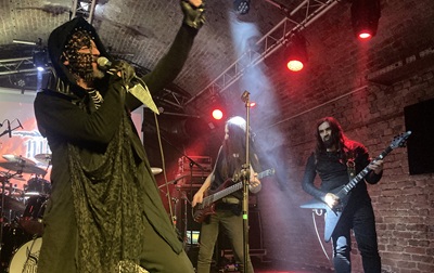 Die nächste Band des Morbidfestes wird etwa vierzig Minuten spielen, um das gleich vorweg zu nehmen. Nightfall beginnen mit einem sehr basslastigem Grollintro. Der Fünfer inklusive Bassistin Vasiliki trägt schlicht schwarz. Ihr Sänger Efthimis tritt mit Halbmaske auf und hält die meiste Zeit eine Dolchatrappe in der Mikrofonhand. Seine Animationen, das Publikum zu aktivieren, funktionieren schon nach dem ersten Song „I Hate“ vom aktuellen „Children Of Eve“ Album. Die textilen Banner entfallen bei den Bands heute, dafür wird ihr Logo im Back auf eine Leinwand projiziert. Die Griechen liefern höhere Tempi gern mit Doublebass, und bei den bekannten Leads von „The Cannibal“ werden Arme gereckt. Cooler Auftritt der extremen Mittelmeerstaatler, die Menge ist zufrieden.