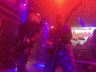 Um dreiviertel zehn bringt uns ein aus dem Back abgespieltes Spoken Word Intro zu Terrorizer, von sehr vielen Besuchern hier heiß erwartet. Da hängt baumelnd reichlich Gebamsel am Mikrofonständer, wohinter Shouter Brian bald komplett verschwindet, dass man sein Facepainting erst irgendwann später erkennt. Die Deathgrinder, einheitlich samt Basser David Vincent (ex-Morbid Angel) in Camouflagehosen, spielen im Kern ihr ganzes „World Downfall“ Debütalbum am Stück. Die Tube darf sich grad etwa nur halbvoll nennen, aber die Stimmung ist sehr gut und der Pit wird zu „Human Prey“ für eröffnet erklärt. Wie erwartet wird Vollgedresche und Maximalgetöse geliefert, und alle haben Spaß. Sogar der Stagediver mit der zugezogenen Platzwunde, weil er ohne Check, wer ihn fängt, einfach springt. Dagegen sehr angenehm und bemerkenswert, dass der Kiosk in der Halle nicht nur für Knabbereien und Kaffee geöffnet hat, sondern in seinem Sortiment auch Matrix-Dildos anbietet. Eine Besucherin im Shirt von Terrorizer bemerkt die reichhaltige Auswahl. Ein Song wird dem vor zwanzig Jahren verstorbenen Napalm Death und Terrorizer Gitarristen Jesse gewidmet, bis nach über einer Stunde Spielzeit das Gebamsel zur Ruhe kommt.