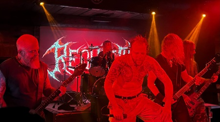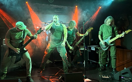 Los geht es heute kurz nach 20:00 Uhr mit FreaKings aus Bubendorf. Die Band wurde bereits 2008 gegründet, ist mir aber bis zum heutigen Zeitpunkt unbekannt. In regelmäßigen Abständen hat man bisher vier Alben veröffentlicht, das letzte „Rise Of Violence“ stammt aus dem Jahre 2019. Der Gig des tight aufspielenden Trios steht nicht gerade unter einen guten Stern. Kaum hat man den Set eröffnet, reißt eine Gitarrensaite. Zum Glück ist Jonathan (Sänger/Gitarrist) vorbereitet und hat eine Ersatzklampe in Griffweite, so dass es nach nur wenigen Minuten Unterbrechung weiter geht. Man merkt der Band aber ihre, trotz fortgeschrittenem Alters der Musiker, noch limitierte Bühnenroutine an, denn bei einer erfahreneren Band hätte hier Basser Toby schnell das Mikro übernommen und das Publikum unterhalten, so dass sein Mitstreiter die Klampfe hätte stimmen können. Aber nein, so muss Jonathan während des Stimmens auch noch mit dem Publikum kommunizieren. Das hätte man eleganter lösen können. Etwas später im Set kommen noch Probleme mit dem Gitarrenverstärker auf, wodurch nochmals ein paar Minuten Unterbrechung im Set resultieren. Wenn man kein Glück hat, kommt auch noch Pech dazu. Glücklicherweise lassen sich die technischen Probleme relativ schnell beheben. Soundmäßig spielen die drei Herren druckvollen Thrash Metal, der aber ohne kompositorischen Tiefgang daher kommt. Ich höre immer wieder coole Slayer-Elemente oder Einflüsse der Bay Area Größen heraus, aber im großen Ganzen ist mir die Musik zu eintönig. Für zwei bis drei Songs ist das völlig okay, aber selbst um eine Dreiviertelstunde zu füllen, ist da zu wenig Variabilität und Eigenständigkeit im Spiel. Die vielleicht 30 Anwesenden spenden Höflichkeitsapplaus, nur der eine Herr direkt vor mir scheint mehr angetan zu sein, und kann sein Zappeln nur schwer unter Kontrolle halten. Instrumental sauber und druckvoll gespielt, aber zu wenig Eigenständigkeit im Sound, ist mein ernüchterndes Fazit des Auftritts. Trotzdem ein solider Start in den noch langen Abend.