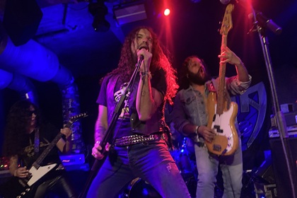 Zeit für die klassischen Oldschool Metaller und Speedfreaks von Hyena. Als ihr sehr cooles Debütalbum „About Rock ‚n‘ Roll“ vor gut einem Jahr erschien, haben wir die Peruaner mit Karloff und Palantyr im Oberhausener Helvete live gesehen. Daran haben wir sehr gute Erinnerungen, und weil sie damals so gepunktet haben, und man die Jungs hier in unseren Breiten nicht so oft zu sehen bekommt, finden wir uns natürlich auch hier ein, um ihren Klängen zu lauschen. Kantig und mit Arschtritt geht die Abfahrt mit „Metal Machine“ und „Tokyo Nights“ los, wozu die ersten Reihen amtlich in Bewegung kommen. Die fünf Altschuler haben richtig Bock und machen mächtig was los. Als die Leadgitarre die lange Version von Holocausts „Heavy Metal Mania“ in den Raum wirft, bricht der Damm, denn da zappelt alles. Es zeigt „Nightriders“ deutlich, dass die Höhen sitzen, aber sie haben noch einen sehr bekannten Klassiker auf der Pfanne, nämlich „The Beast“ von den derzeit auf Undergroundevents ziemlich angesagten Randy. Es gehen einige Arme hoch und dieses Metalpublikum entpuppt sich für einen Mittwoch glücklicherweise nicht ganz so lahm. Derzeit nicht allzu selten auf den Bühnen der Gegend anzutreffen, ist ex-Sodom Gitarrist Andy Brings. Der Mann steigt auch heute hier mit auf die Bretter, um Priests „Breaking The Law“ mitzuzocken, wobei Basser Jorge sein Arbeitsgerät wie Ian Hill schwenkt. Während sich hinten am Merchandise schon die Shirts für 25 Euro abgreifen lassen, wird noch mit Andy „Ace Of Spades“ nachgeschoben. Damit sind siebzig Minuten voll. Schließlich und endlich kann man sagen, Hyena haben heute Abend alle Register gezogen. Wohl dem, der hier heute Abend den livegespielten Klängen beiwohnen konnte.